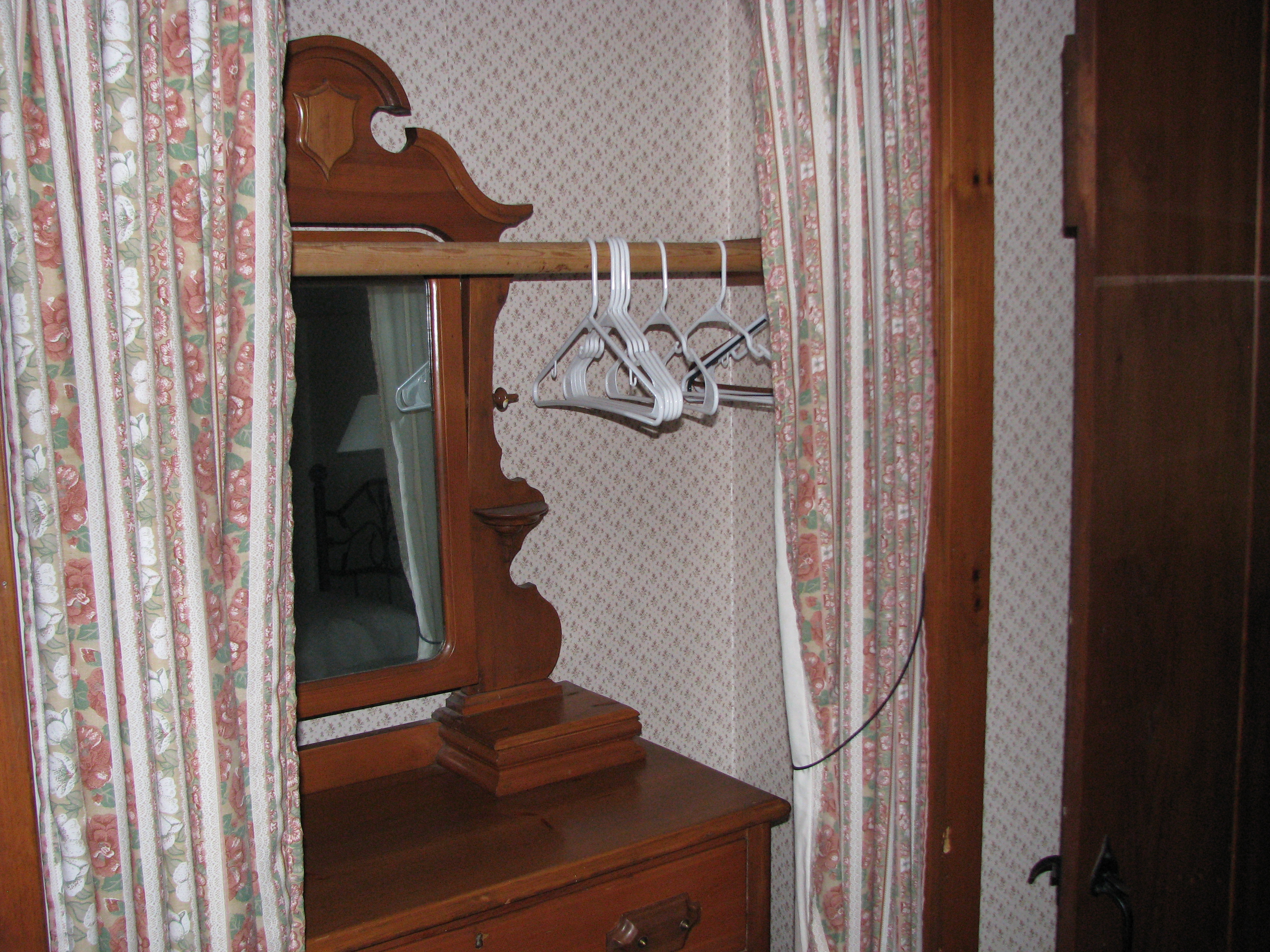 After peeling away the 1970’s wallpaper and giving the room a fresh coat of paint, we added a new mattress and box spring to the antique bed frame. Bringing in an antique bureau and mirror from another room completes the look,